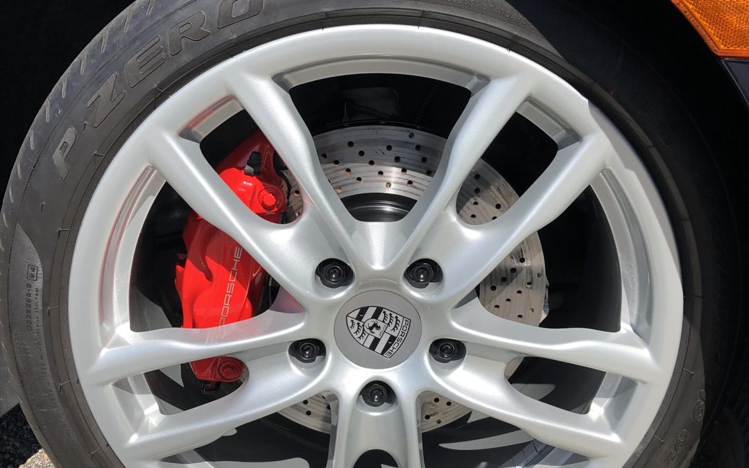 Red Porsche with freshly refinished Porsche brake caliper visible through the wheel